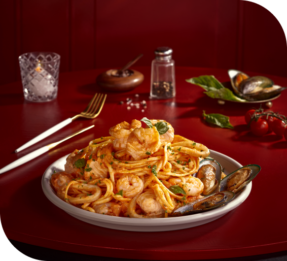Linguini pasta with salmon, baby shrimp, tiger prawns & calamari tossed in a garlic & basil rosé sauce.